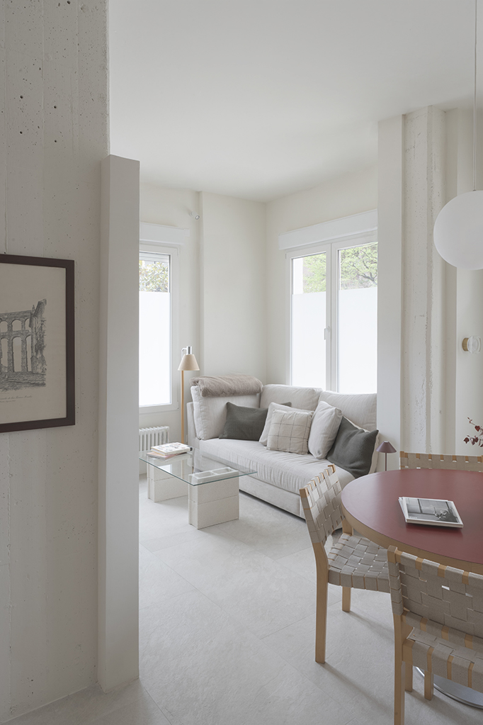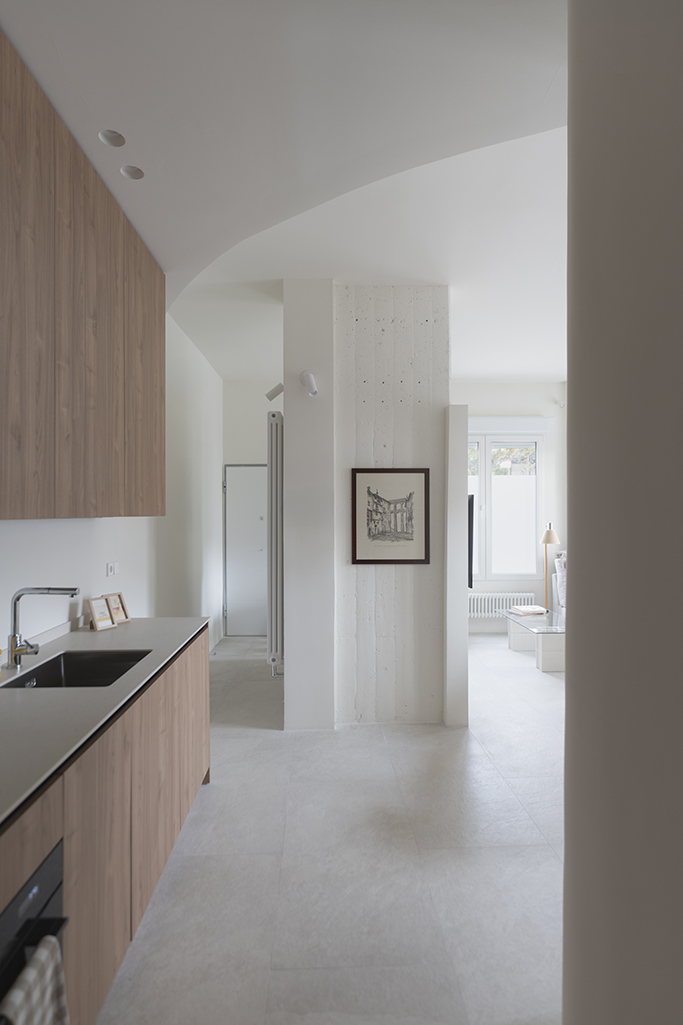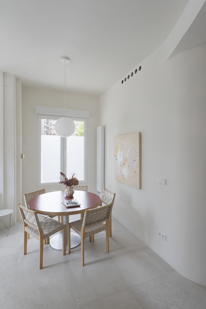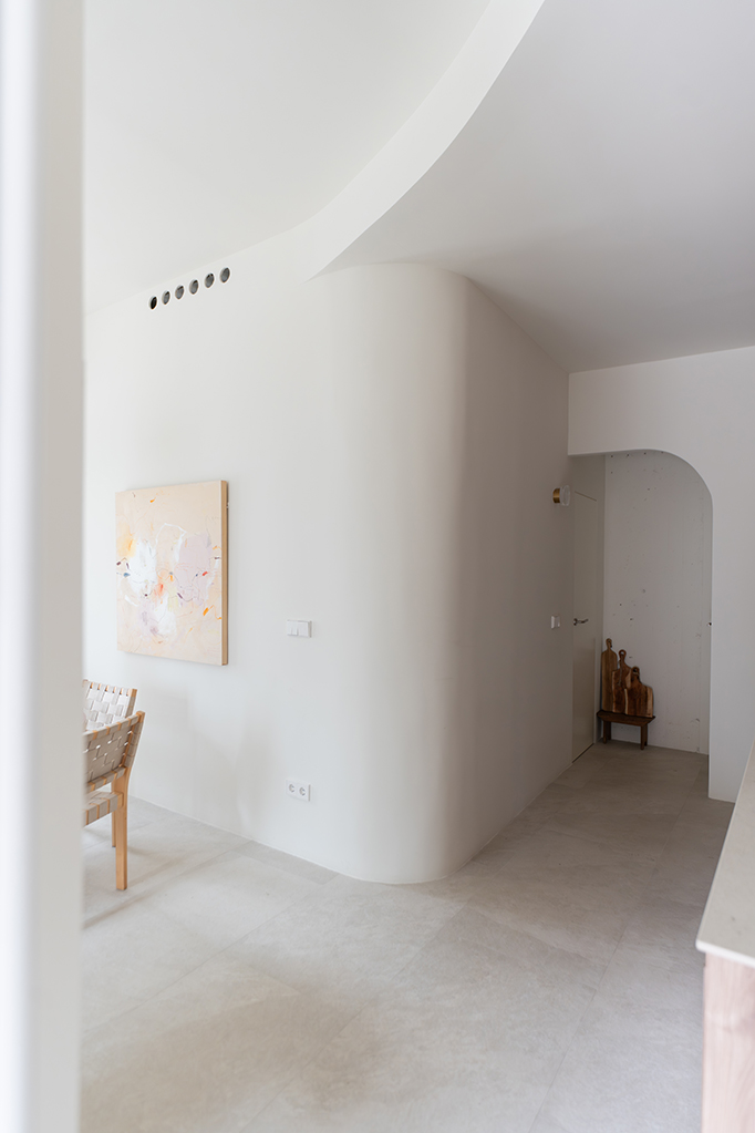 Para este proyecto, el principal reto fue dotar al espacio de la calidez propia de su nuevo uso: una vivienda acogedora diseñada para una pareja. Tras haber funcionado anteriormente como bar, la propuesta busca transformar su carácter original mediante formas orgánicas que delimitan los espacios de manera sutil, reduciendo la sensación de vacío generada por los techos altos y creando una atmósfera más doméstica a través de una iluminación cálida.