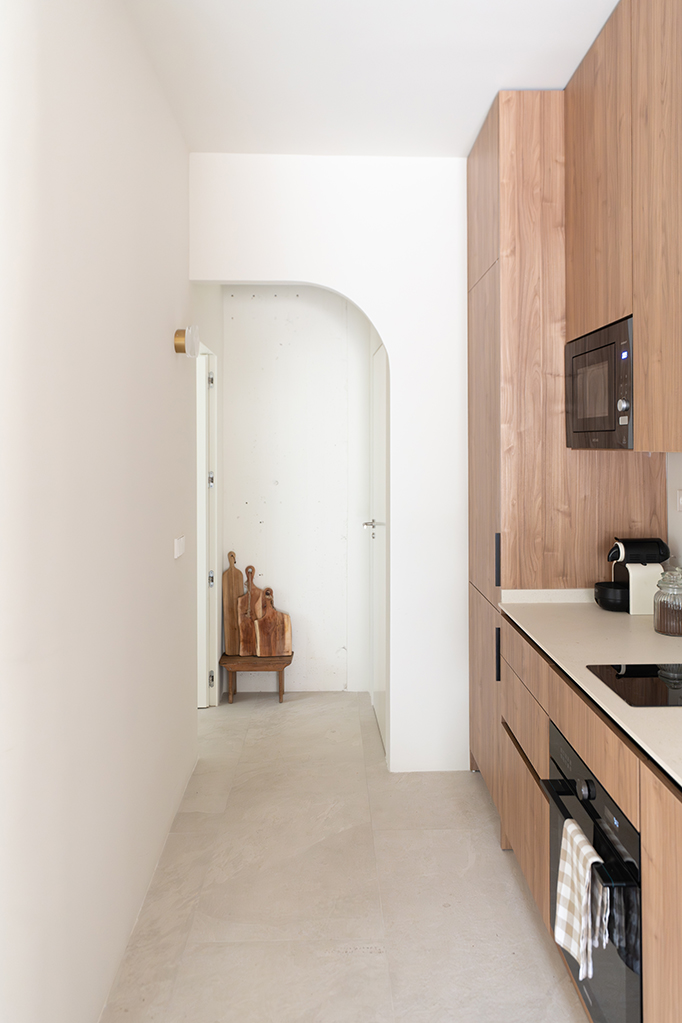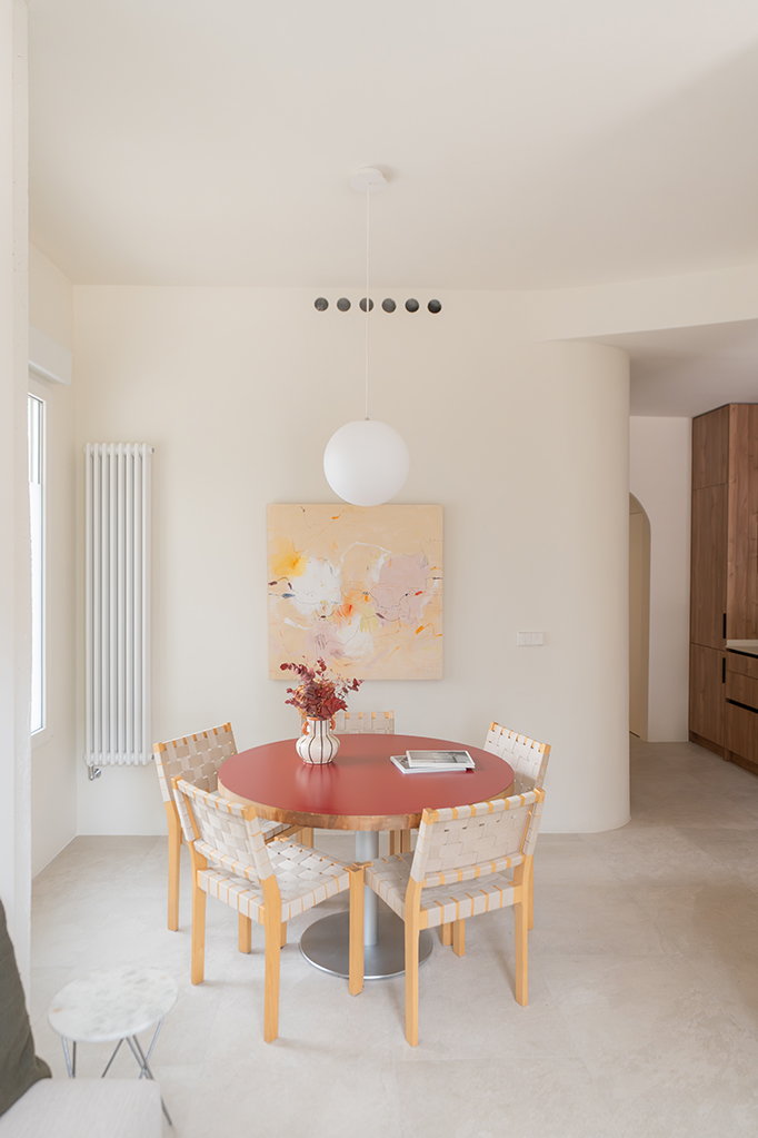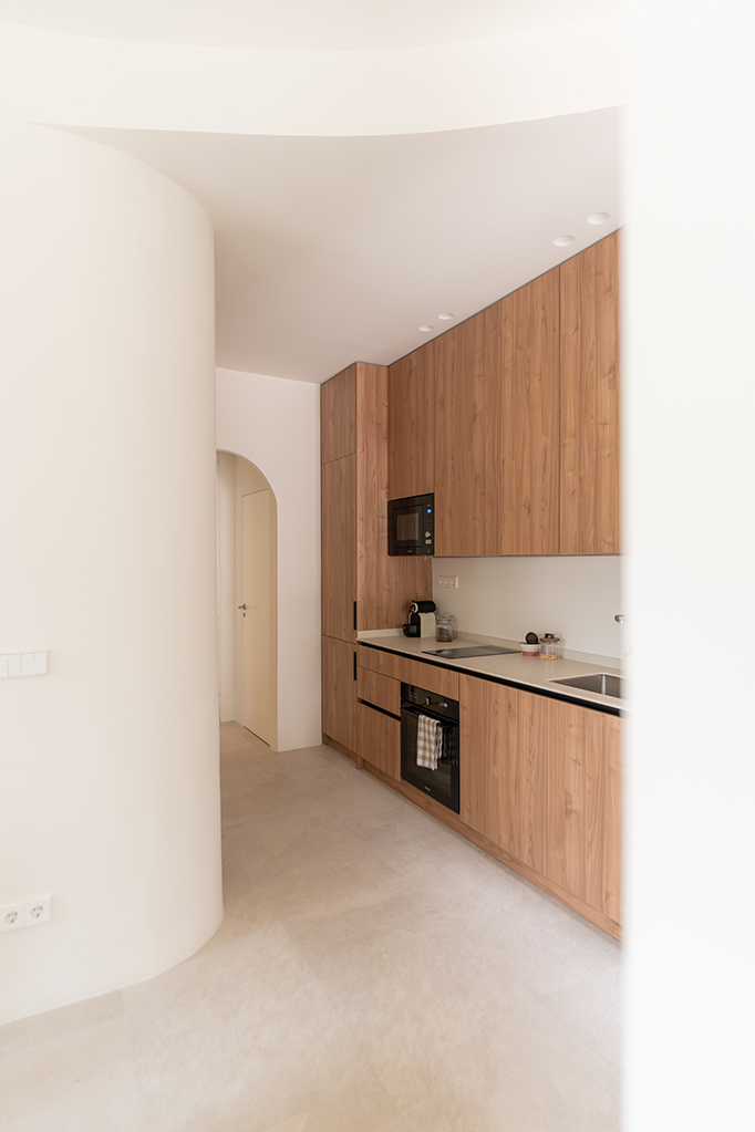 El diseño también prioriza la optimización y el aprovechamiento del espacio, incorporando soluciones como muros curvos y mobiliario integrado que organizan las distintas áreas con naturalidad y continuidad visual.